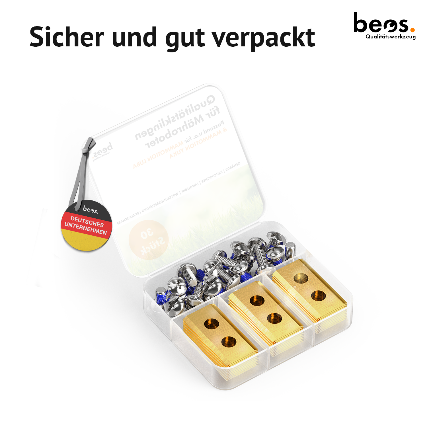 Zum Fixieren der Präzisionsklingen liefern wir 30 Schrauben mit Schraubensicherungslack. Dieser schützt vor vibrationsbedingtem Herausdrehen.